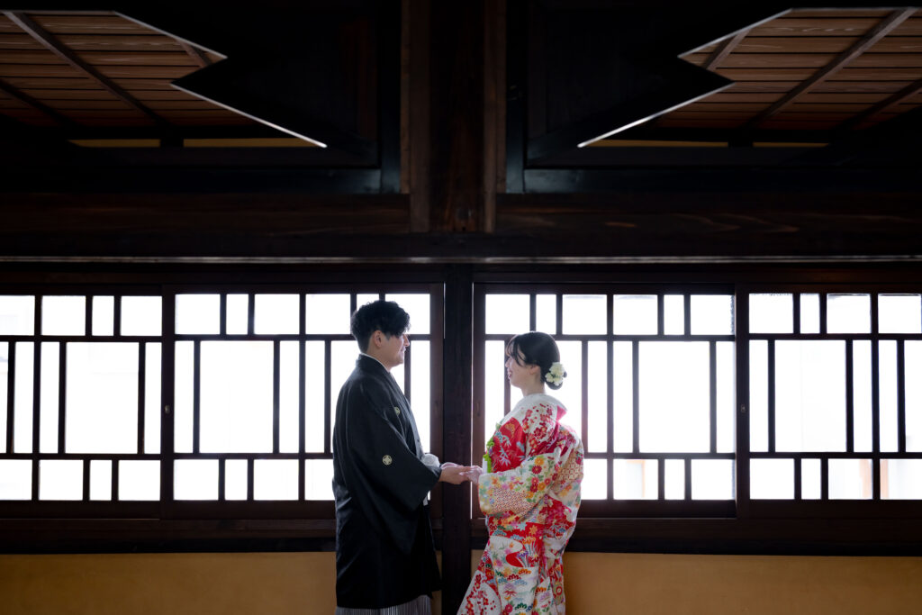 お衣装を着替えて、引き続き和装スタジオでの1枚。大きな窓から差し込む光が、非日常の空間を作り出します。築100年の古民家となっており、さまざまなバリエーションのお写真が撮影可能です。