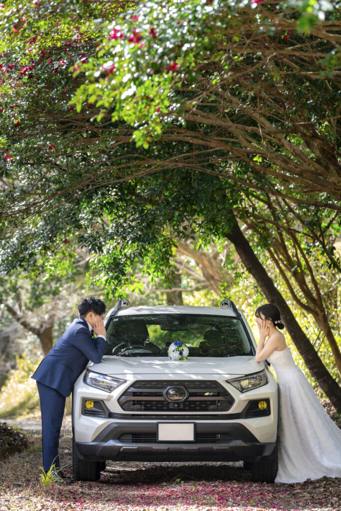 お二人の愛車との撮影。THE WEDDING TOWNでは、お車・バイクとの撮影も行っております。大切な愛車を美しくお写真に残すお手伝いをさせていただきます。