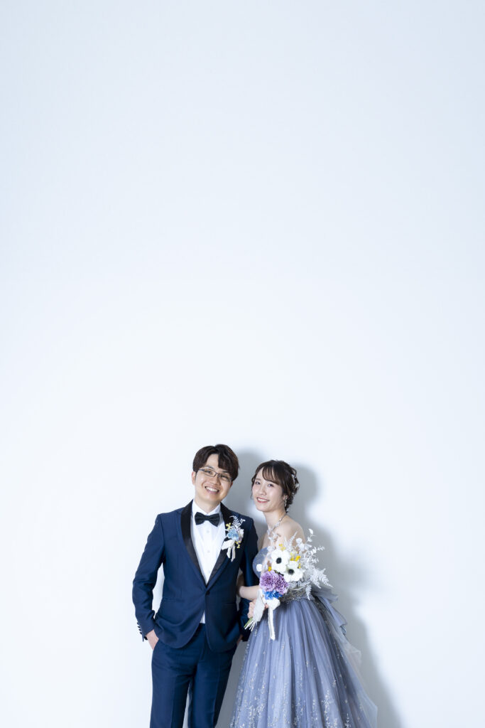 こちらも洋装スタジオでのお写真。先ほどのお部屋とは異なり、クールな雰囲気での撮影。私たちの洋装スタジオでは、さまざまな背景・お部屋をご準備しております。おふたりのお好きな雰囲気に合わせて撮影が可能になっています。