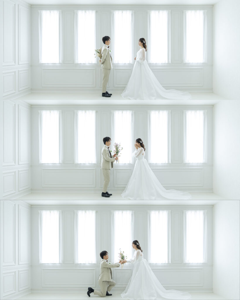 真っ白な空間での、プロポーズシーンです。柔らかい光が特徴的なお部屋での撮影が可能となっています。一連の動作を連続で撮影することで、静止画でも動きのある思い出を残すことができます。