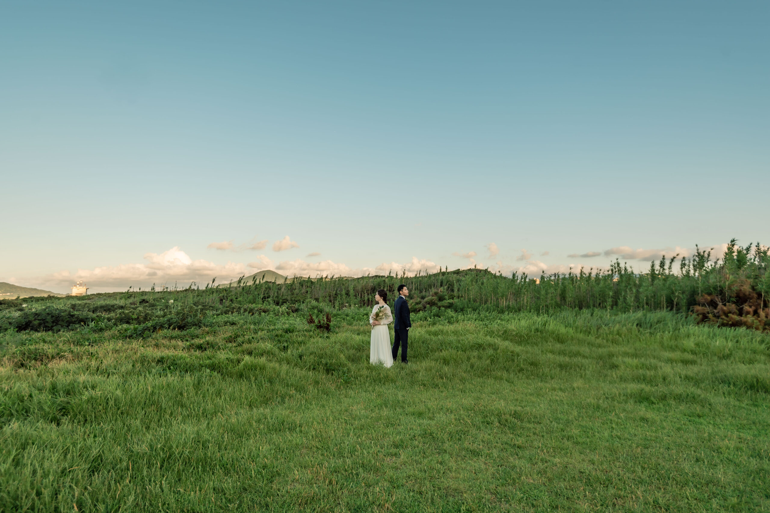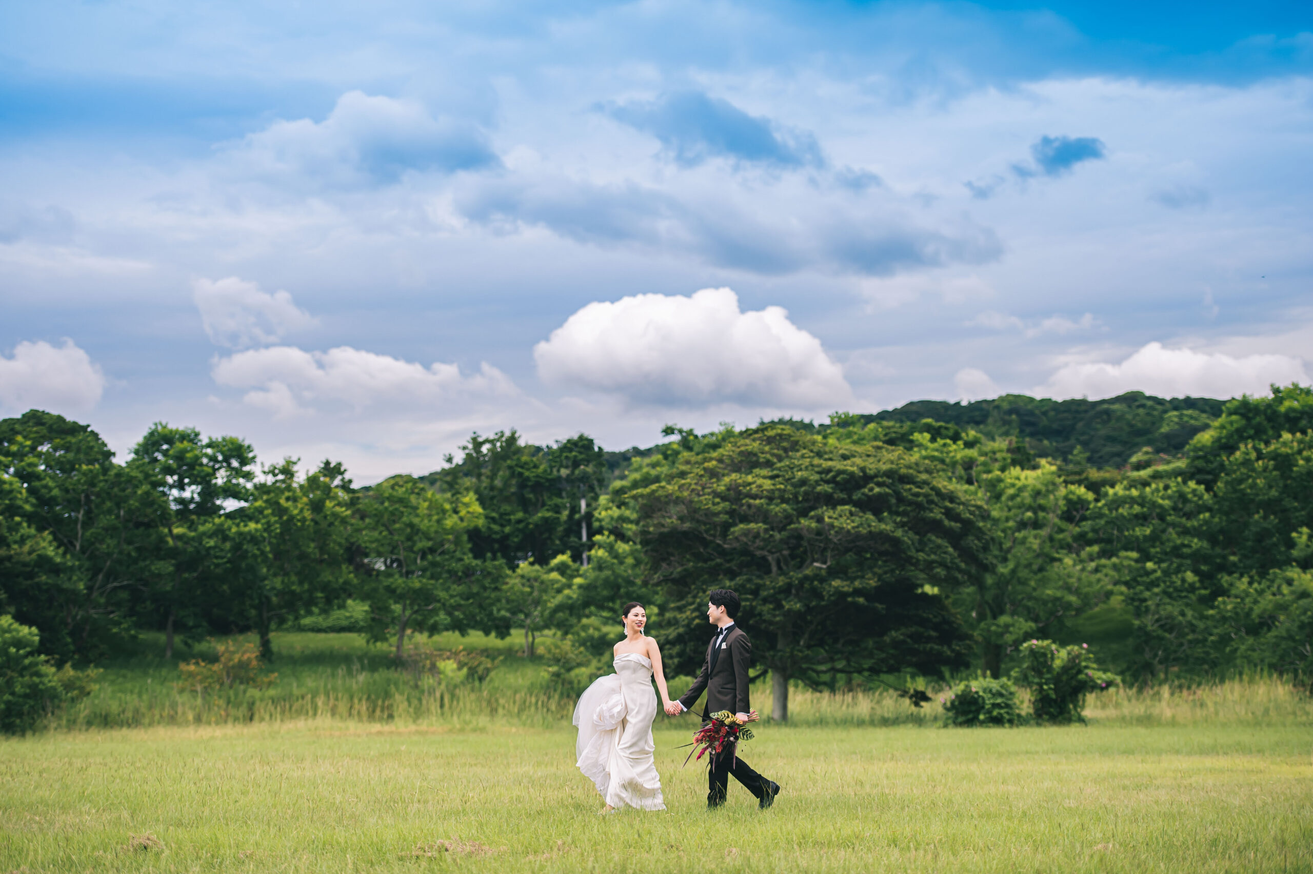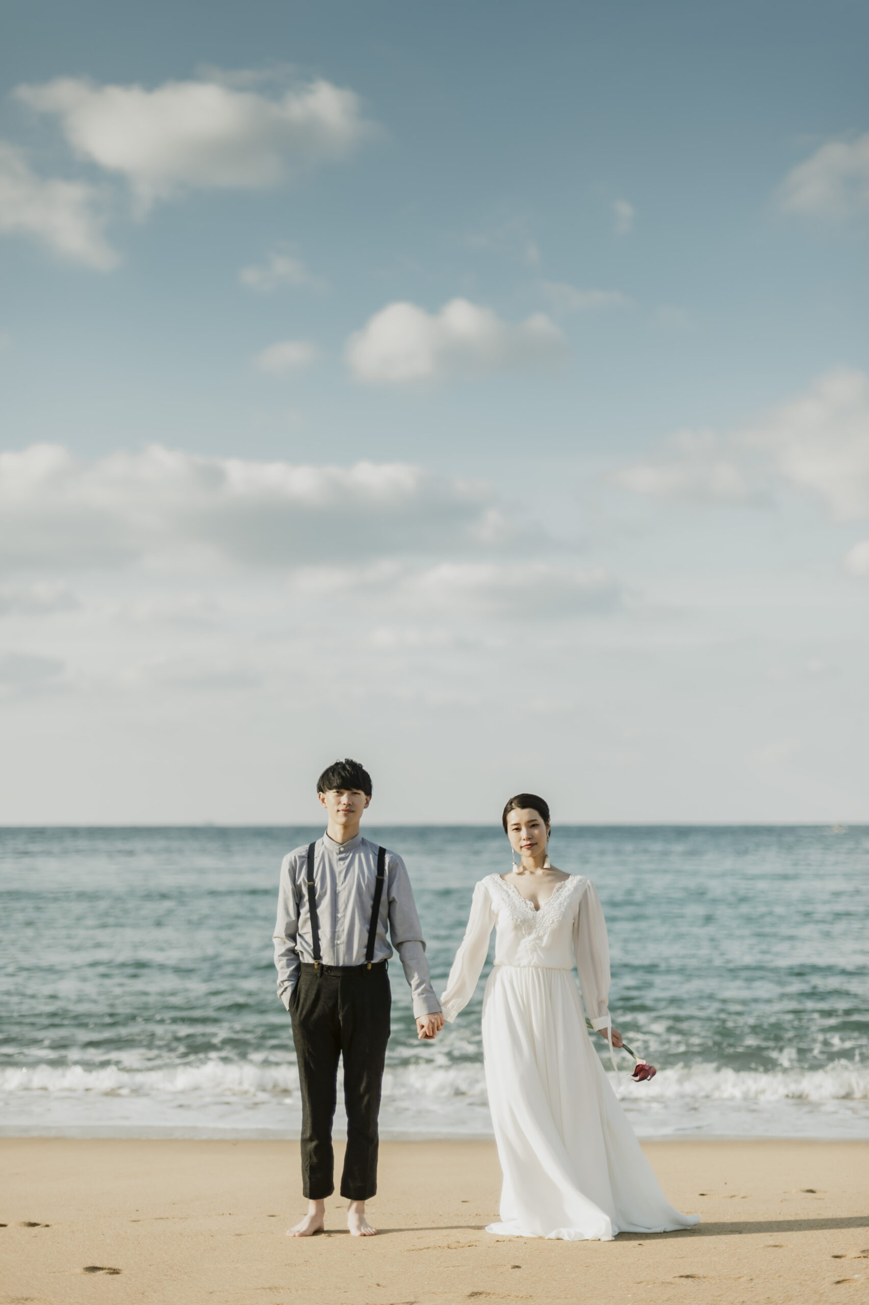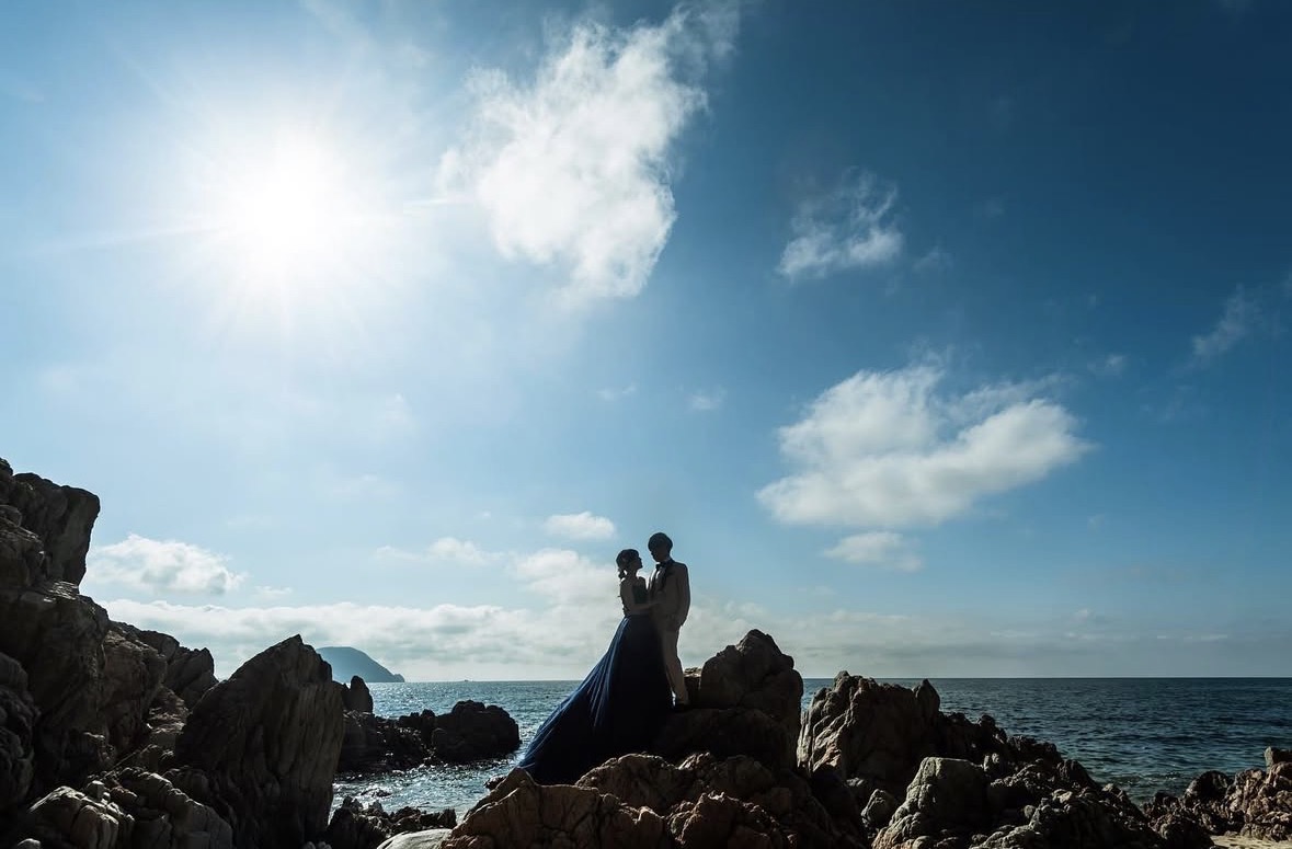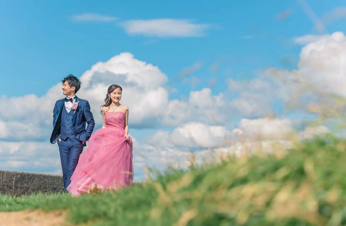 海と空が広がる志賀島。自然光と潮風に包まれ、開放感あふれる前撮りが叶います。